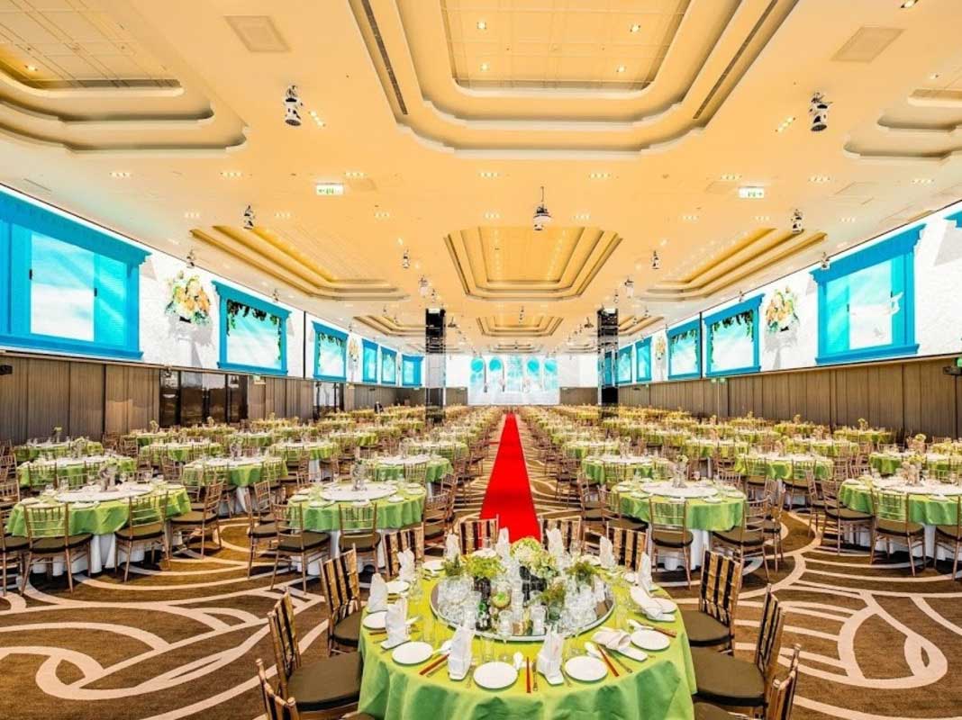 時尚奢華、氣派,場地挑高10米高,為全亞洲最大360度LED環場式屏幕,最大容納380桌。