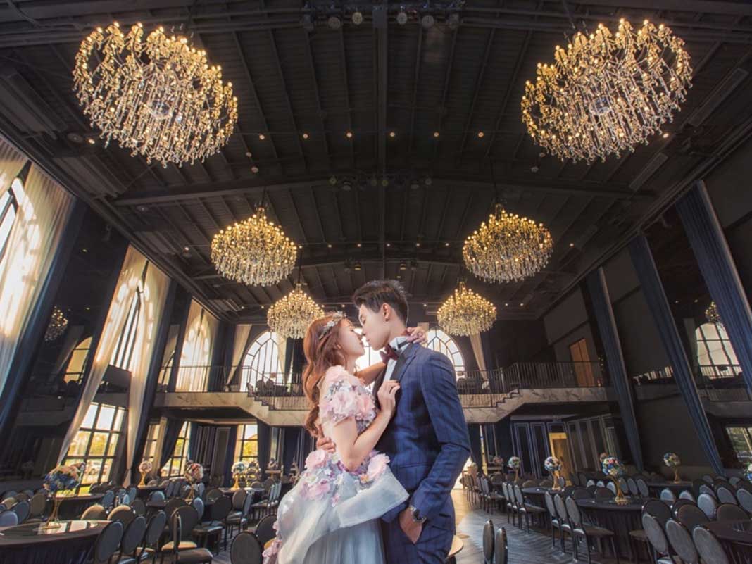 融合東方美學與西方貴族概念的精神,自然採光的巨型玻璃天井,宴會廳採用台灣中部竹山的竹衣裝置藝術,典雅又摩登的莊園風格,完美呈現私人宅邸婚禮。