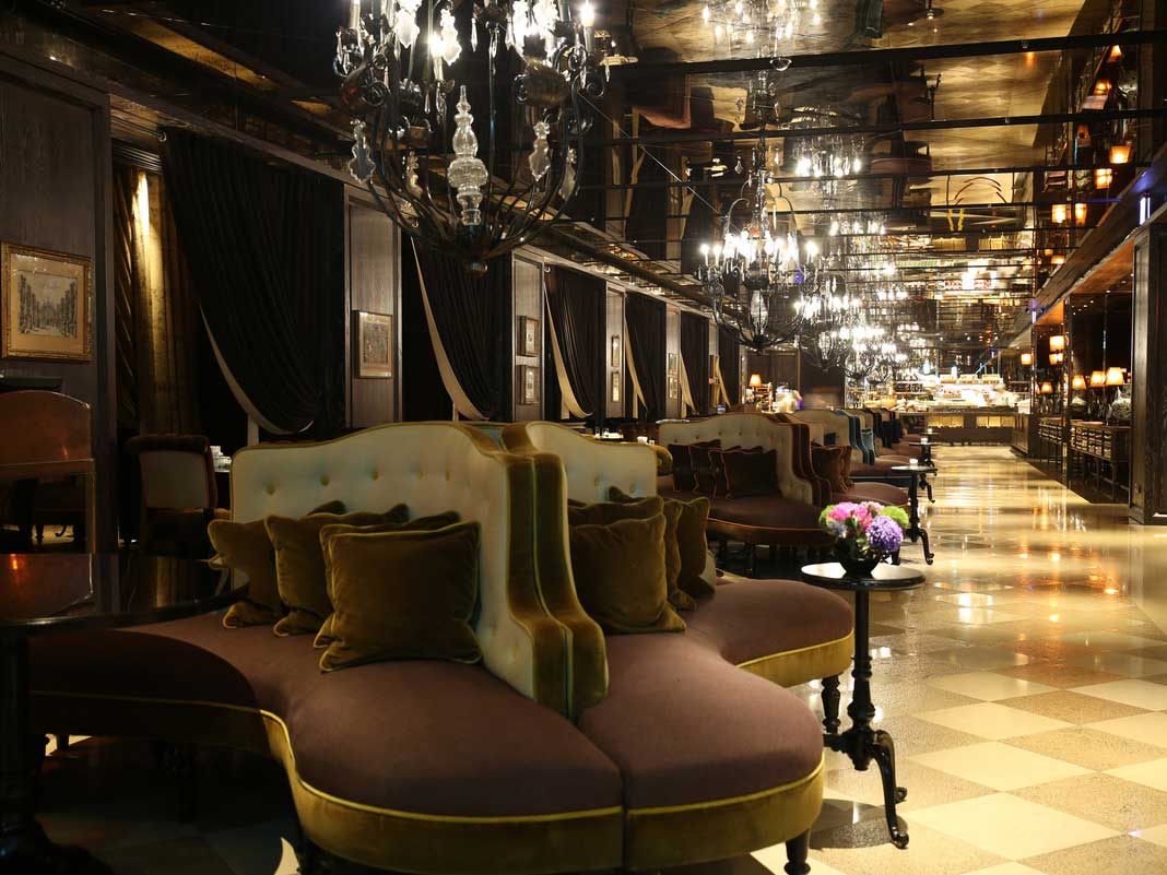 安妃屈蒂宴會廳為沉穩復古的莎芙銀綠天花板,與奢華感十足的金色裝置,再搭配上石紋拼貼的幾何磚地板,傳達出新與舊的交疊、浮華濃郁的氛圍。