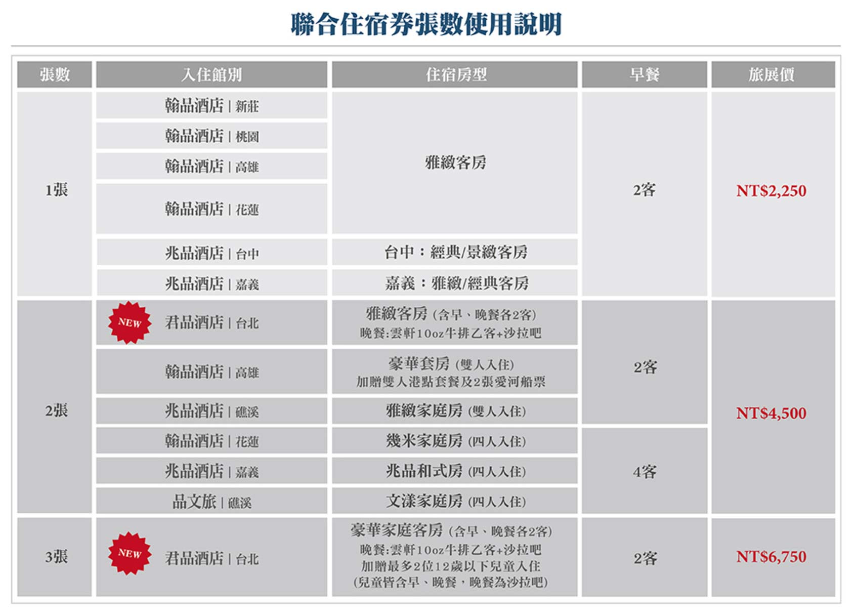 (2)雲品經典山景一泊一食住宿券:旺日加價NT$2,000,假日加價NT$4,600,大假日加價NT$7,000;加人加價:成人NT$2,599/位,兒童NT$1,699/位