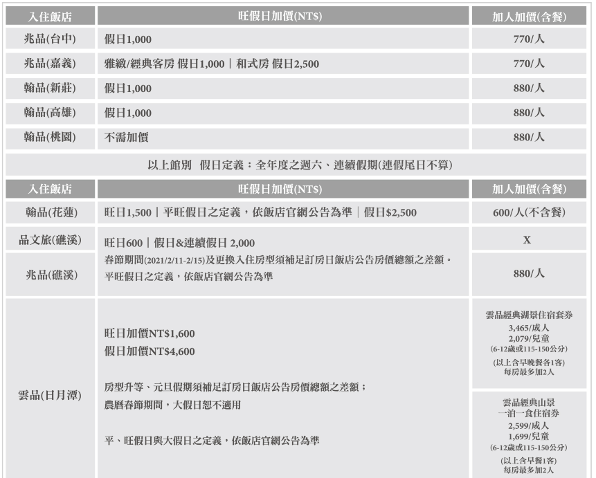 ➤旺假日加價表