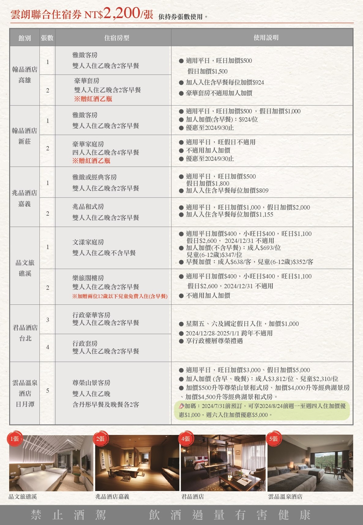 ※限時加碼!2024/8/24前持5張券入住雲品,可享週一至週四入住加價優惠$1,000,週六入住加價優惠$5,000。(需於7/31前預訂)